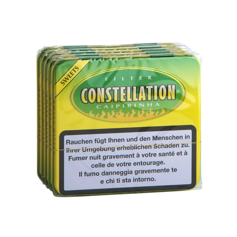 Die Constellation ist eine elegante Filter-Cigarillo mit einem dezent gesüssten Mundstück und schmeckt unvergleichlich verführerisch nach einer Pina Colada mit frischen Ananas und Kokosnüssen .