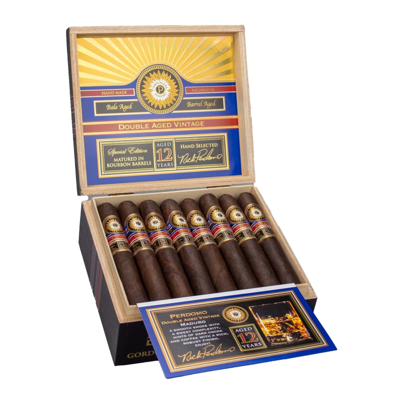 Die Perdomo Double Aged 12 Year Vintage sind Zigarren, die mit Perdomos besten, 12 Jahre alten Einlagetabaken, Um- und Deckblättern verarbeitet wurden. Nachdem diese seltenen Tabake zehn Jahre im Ballen optimal nachfermentiert haben, werden sie nochmals für zwei Jahre einer weiteren Fermentation in Bourbon-Eichenholzfässern unterzogen. Daher auch die Bezeichnung Double Aged. Dieser sehr aufwändige Prozess wird für alle Tabakblätter der Mischung (Seco, Viso, Ligero) sowie für die Umblätter und Deckblätter separat vorgenommen. Dazu wird der Tabak in vorher ausgebrannten Bourbon Fässern aus Weißeiche gelagert, dies erbringt die perfekten Farben, Texturen, Aromen dieser Tabake. Zusammengenommen lässt dies jede Double Aged 12 Year Vintage zu einem perfekt ausbalancierten und vollen Geschmackerlebnis werden