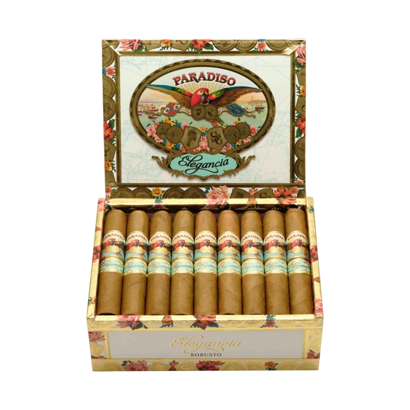 Die Paradiso Elegancia ist eine Zigarre mit einem milden bis mittleren Stärkeprofil, die von der Familie Garcia in Esteli hergestellt wird. Sie präsentiert sich mit einem goldblonden Connecticut-Deckblatt, welches aus Ecuador stammt. Der restliche cremige Blend, also Umblatt und Einlage, besteht aus Tabaken von den Garcia-Familienanwesen in Nicaragua. Geschmacksnoten von weissem Pfeffer, Cashewnüssen, Mandeln und Kaffeebohnen begleiten seidige Gewürze in einem üppigen und zugänglichen Blend. Diese Zigarre richtet sich an Liebhaber milderer Zigarren, die auch eine gewisse Stärke zu schätzen wissen, bietet aber auch Aficionados, die vornehmlich nach Komplexität suchen einen grossen Genuss.