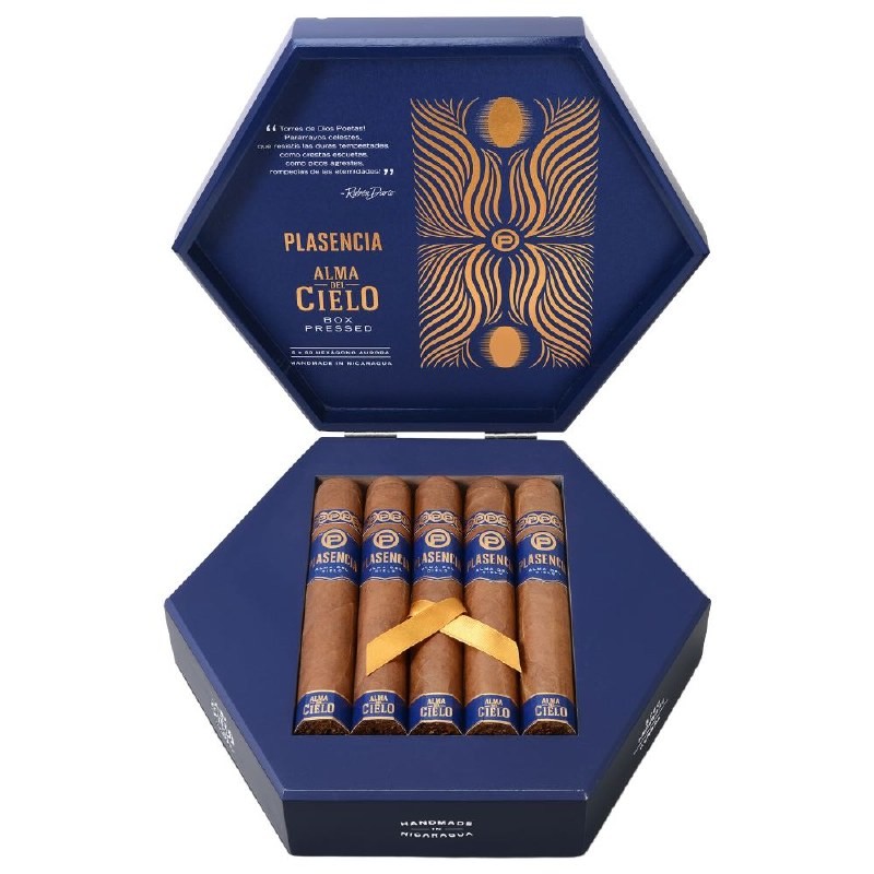 Die Plasencia Alma del Cielo ist in drei Formaten erhältlich, darunter auch ein sechseckiges ‘Hexagono’-Format, das nicht nur optisch auffällt, sondern auch für eine besonders gleichmässigen Abbrand sorgt. Verpackt alle Zigarren in edle 10er-Kisten mit elegantem Design.