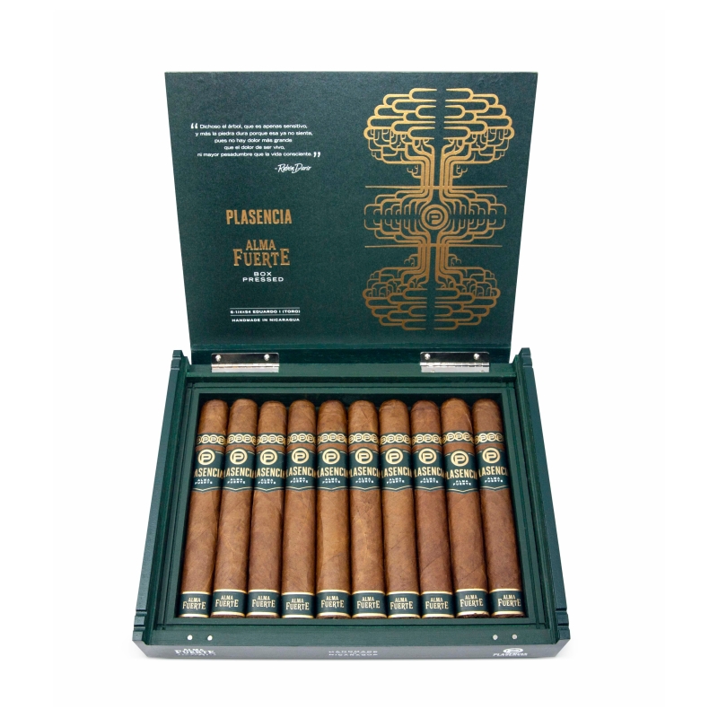 Der neue Blend für das Toro-Format, welcher nun ebenfalls ein Colorado-Claro-Deckblatt hat, unterscheidet sich von der ursprünglichen Toro der Alma Fuerte Linie. Sie finden immer noch die charakteristische Tiefe und Komplexität eines mehr als 10 Jahre alten Tabak, aber auch ein milderes, süsseres und cremigeres Profil, das es einer grösseren Breite von Aficionados erlaubt, die Zigarre zu jeder Tageszeit zu geniessen. Aroma-Profil: Kakao, Mandeln, mit einem Hauch von Muskatnuss und Zedernholz in den letzten Noten.