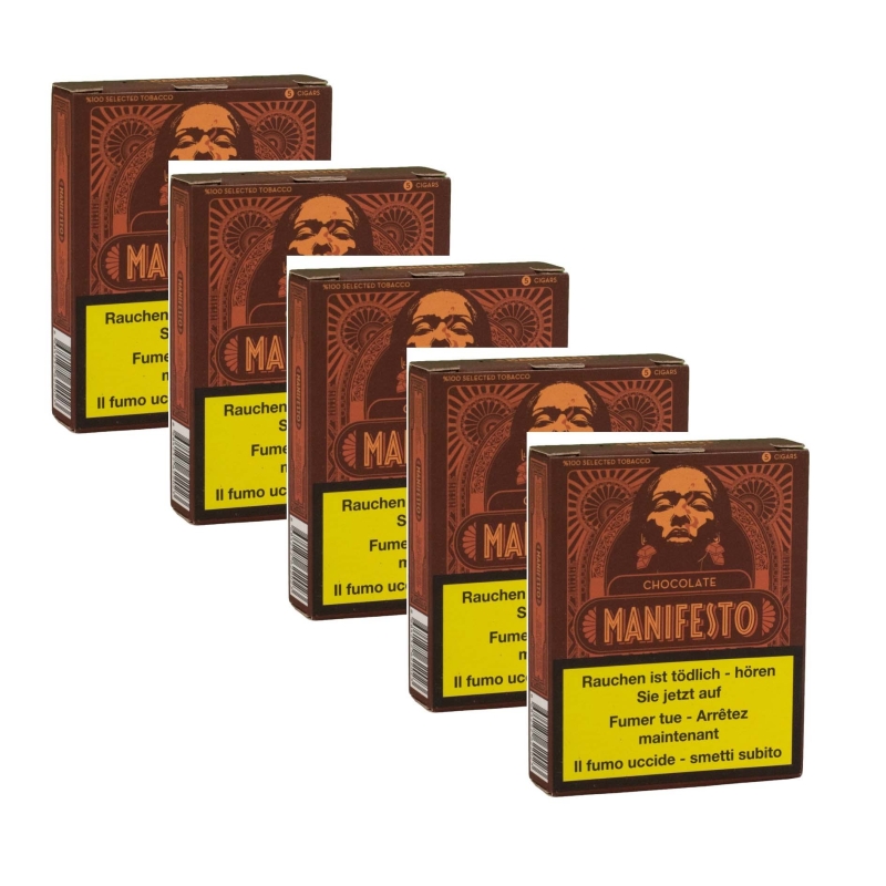 Die Manifesto Zigarre vereint sorgfältig fermentierte Tabake mit der exklusiven Manifesto Infusion Technique, einer patentierten Veredelungsmethode, die natürliche Aromen auf harmonische Weise mit dem Tabak verschmelzen lässt. So entstehen aussergewöhnliche Geschmacksvarianten wie Classic, Chocolate, Caramel, Lemonade und Black Grape, die den Charakter des Tabaks unterstreichen, anstatt ihn zu überdecken. Ganz ohne künstliche Stoffe und mit einem angenehm weichen Abgang bietet Manifesto ein authentisches Raucherlebnis, das Anspruch und Leidenschaft verbindet. Manifesto ist keine gewöhnliche Zigarre – sie ist ein Statement für Stil, Qualität und Individualität.